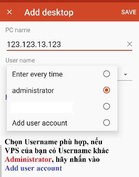 Bước 3. Điền các thông tin VPS vào ứng dụng Remote Desktop
